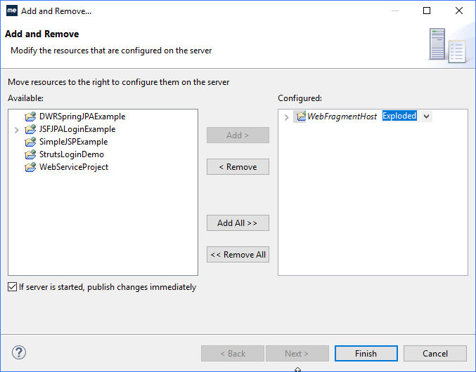 在“Available”列中选择WebFragmentHost项目,单击“Add”,然后单击“Finish”。