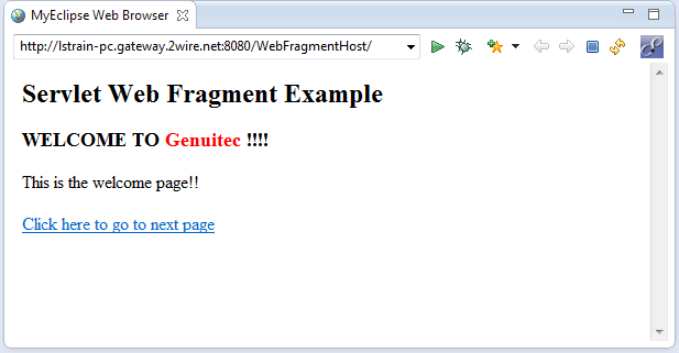 选择MyEclipse Tomcat服务器,然后单击“Finish”。Web片段中的WelcomeServlet.java文件在浏览器中显示一个页面。