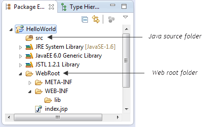 。在此示例项目中,显示了两个子文件夹:src和WebRoot。该SRC文件夹包含Java源代码,如Java包和它们的类、接口。WebRoot文件夹是JavaEE的web存档(WAR)结构图案化后的文件夹结构的根/基本文件夹。根文件夹在形式上称为Web根,它包含三个子文件夹。Web内容和资源(例如JSP和HTML文件、标记库和JAR文件)位于Web根文件夹及其子文件夹中。