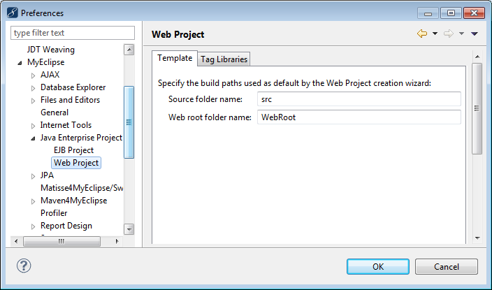 要访问MyEclipse参数,请选择Window > Preferences,展开MyEclipse > Java Enterprise Project,然后选择“Web Project”。