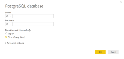 启动PostgreSQL连接器时,现在可以在连接器对话框中指定DirectQuery作为连接模式的选择。