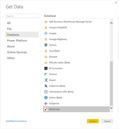 MarkLogic连接器现已普遍推出,您可以在“获取数据”对话框的“数据库”类别中找到MarkLogic连接器。