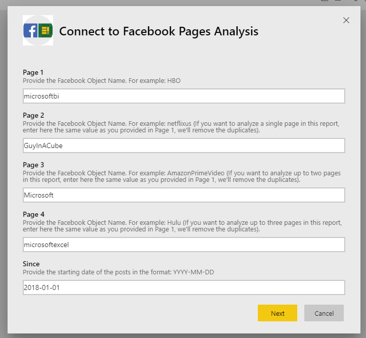 您可以直接在Power BI服务中安装应用程序,并设置其参数以导入最多四个Facebook页面的数据。