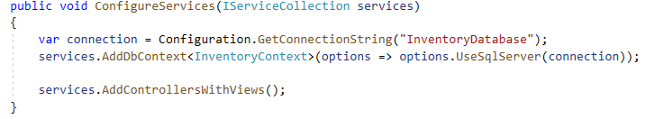 然后我们可以在应用程序启动期间注册数据库上下文服务(InventotyContext)。在以下代码中,从appsettings文件中读取连接字符串并将其传递给上下文服务。