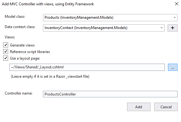 使用Entity Framework选项选择带视图的MVC Controller,然后单击Add。