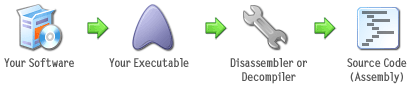 When an attacker tries to crack a compiled application, he will use a decompiler tool which will decompile the machine language code into a more comprehensive code (like assembly code or a higher programming language), doing his research over the decompiled code.