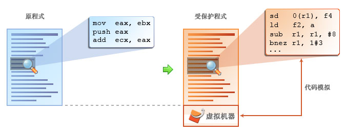 下图展示了一个原来 编译过的程序(在还没有受保护时)以及当它被 Code Virtualizer 保护时所经过的 转变。