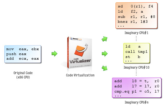 当 一个软件破解者尝试对一组受到 Code Virtualizer 保护的代码进行 反编译时,他无法找到任何本来的 x86 指令,而只会发现一个他或其它特别的 反编译器 完全陌生的、新的指令集。这将迫使 软件破解者使用非常多的努力来研究每一行的代码的意思以及学习每一个受保护程序内的虚拟机器的运作原理。 Code Virtualizer 完完全全地对虚拟码的运行以及个别虚拟机器的学习进行了搅乱,以阻止任何人学习当中的虚拟码是如何运作的。