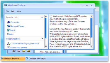 With WebDesktop end users can now experience the same behaviors and appearances of today's popular Desktop application, from mouse and keyboard interaction to extensive drag and drop capability. WebDesktop.NET includes 14 highly advanced components such as DesktopManager, PaneManager, FlyPostbackManager or AJAX-Manager component, WebExplorerPane, Tab, ToolBar, MenuBar, ContextMenu, Notification System, StyleManager, DialogBox, NavPane, Button, and the latest released component included in WebDesktop would be WebDragDropExtender.