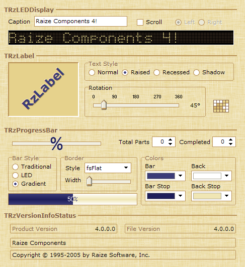 Raize Components is a user interface design system for Borland Delphi and Borland C++Builder. At its center is a collection of more than 125 general-purpose native VCL controls. Built on a foundation of technology first created more than ten years ago, these high-quality components give developers unsurpassed power and flexibility without sacrificing ease-of-use.