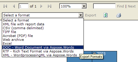 Aspose.Words for Reporting Services makes it possible to export any report in DOC, DOCX, RTF or WordprocessingML format.