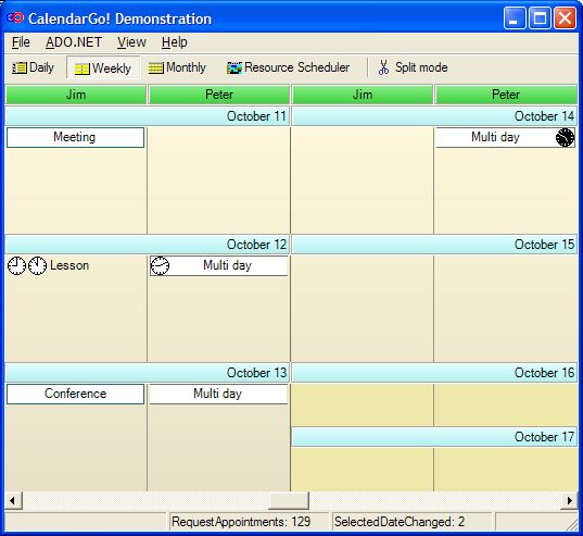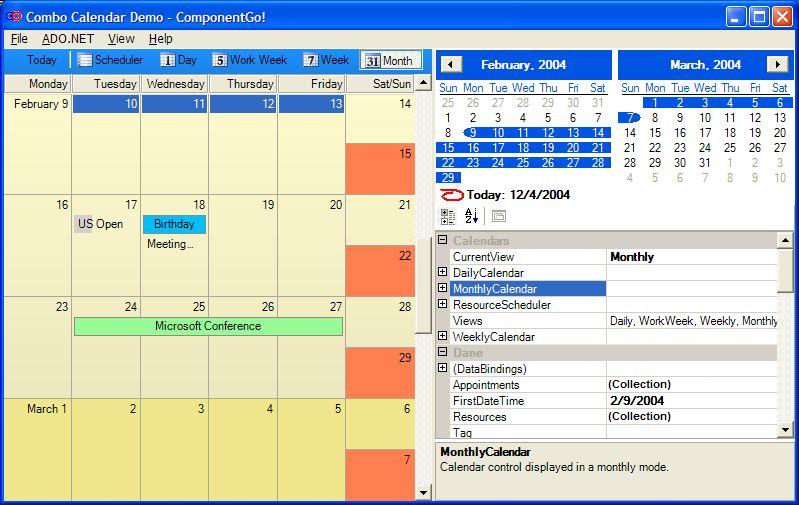 想显示更长时间内的约定吗?请使用MonthlyCalendar控制组件。该控制组件能显示全天以及更长时间的约定。同样能为多资源显示数据。日历的操作与Microsoft Outlook®的日历类似。