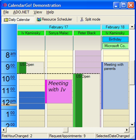 Setup program contains sample applications. A sample application written in Visual Basic.NET demonstrates how to use DailyCalendar control with a Microsoft Access database. Shows a calendar storing appointments' data in a database. Application communicates with a database using ADO.NET and Appointment.Tag property. A ResourceScheduler can be used in a similar way.