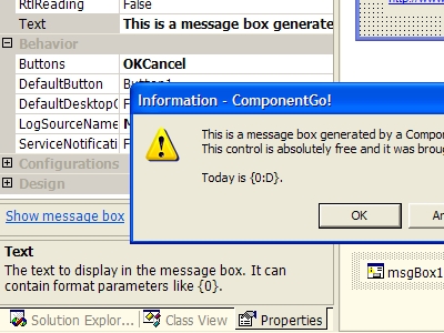 有多少次您花了大量的精力来准备MessageBox.Show(...)参数?有多少次您不得不重新启动程序来查看设置大量参数的结果?您想加快完成这个过程吗?能避免重启并能直接用于Visual Studio以及结果消息框中的MsgBox类就可解决这个问题。而且该控件完全免费。