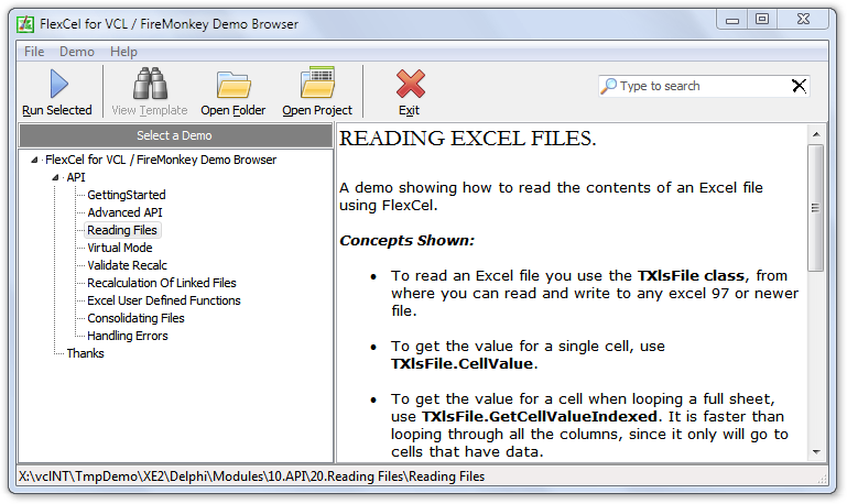 FlexCel for VCL / FireMonkey是一款处理Excel文件的Delphi XE, XE2控件套包。更有大量的API能直接读写本地Excel文件。Flexcel可完成在未安装Excel的OS-X或Windows系统的机器上读取或创建复杂的电子数据表。