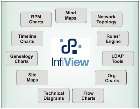InfiView integrated layering system enables placement of smart layer(s) over existing data, static or dynamic (for example: maps, flowcharts, schematic diagrams, LDAP and SNMP) thus creating powerful interactive applications.