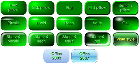 With the latest version of the SDK, you can now create outstanding 3D buttons having several modern rendering surfaces like Aqua, Gel, Vista's "Aero", Office 2003, Office 2007 and many others: just see below some small surface sample: