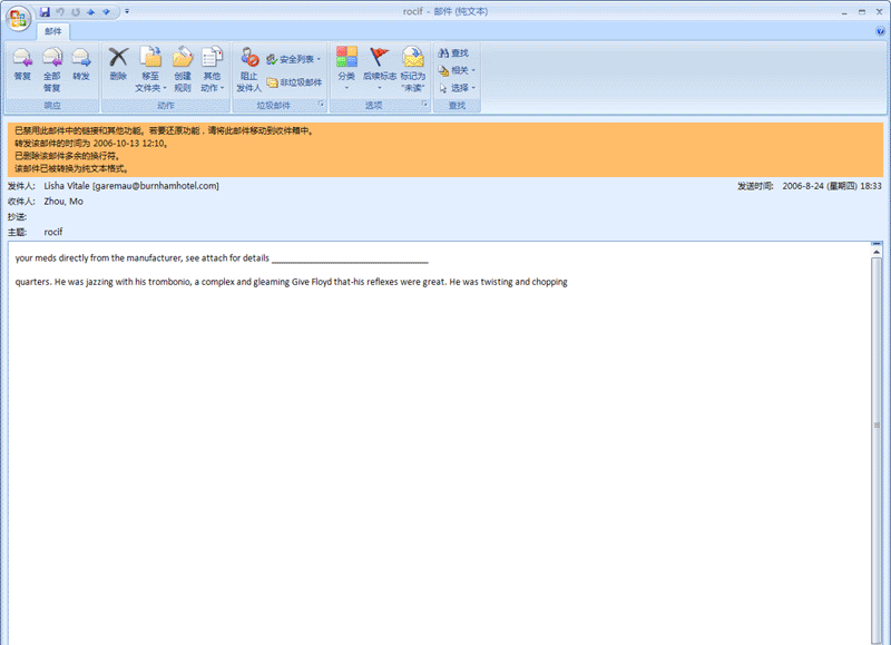 Microsoft Office Outlook 2007 在处理用于盗取身份(一种称为“网络仿冒”的过程)的可疑电子邮件时,将在邮件顶端显示警告,并禁用该邮件中包含的任何超链接。