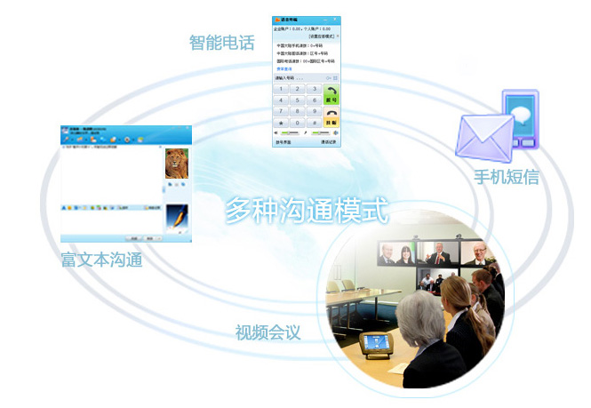 | 跨网络、跨设备;通过单位组织结构、单位通讯录、工作群组、临时讨论组、常用联系人等轻松发起 Simba 统一通信或 Simba企业即时通讯;富文本即时通讯、SIP语音、手机短信、图片、网络视频、白板等多媒体沟通方式满足不同办公条件下沟 通需求;电脑、SIP-IP电话、WiFi手机终端、智能终端,多种接入方式。 | |