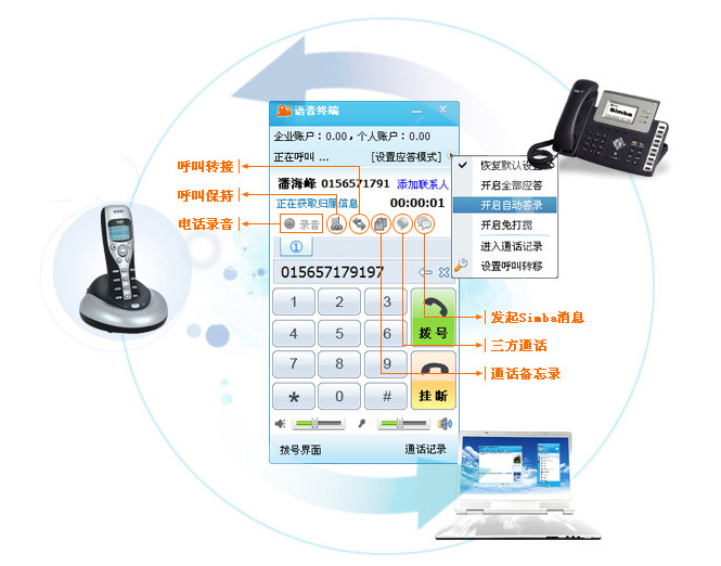 | CD级水晶音质,配合Simba 认证的语音终端外设,异网运营商的网络接入,也可享受优质语音效果;只需拨打对方分机号 码(Simba 企业分机)即可找到分布在全国各地的同事,天涯也在咫尺;并且安全、免费;每一次内部通话都自动建立安全通 道并进行Simba分机专属加密,无法监听;丰富的商务智能应用:在线状态感知、电话录音、遇忙呼叫转移,无应答呼叫转移, 不在线呼叫转移,RingGroup,来电弹屏,Simba企业分机漫游,呼叫转接,三方通话... | |