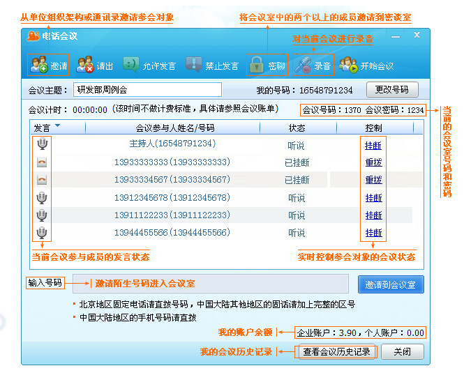 丰富的电话会议控制功能 会议主持人基于客户端软件实现对电话会议管理控制--有效的查看当前会议的参会方信息及状态--对参会方进行静音、挂断等操作--向电话会议模块发出拨出电话指令及电话号码--启动和停止会议录音--结束会议--会议开始过程中随时邀请其他参会对象。