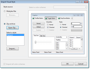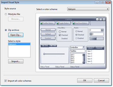 VisualStyler allows you to import any Microsoft Visual Style at design-time, visual styles can be imported directly from an msstyles file or from a Zip archive. The 'Import Visual Style' task can be found on the VisualStyler designer and at the bottom of the VisualStyler properties window.