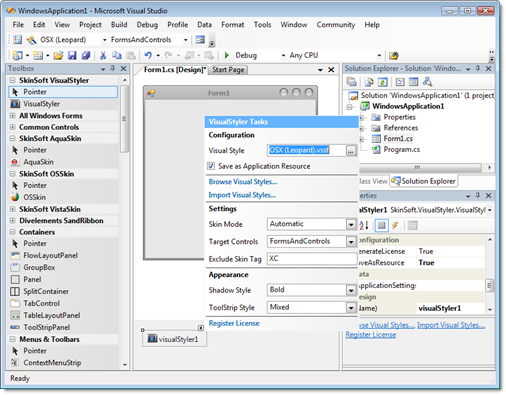 VisualStyler uses the latest smart-tag designers making the component extremely easy to setup and use, and for a fully skinned design-time experience you can use the supplied Visual Studio add-in which extends Visual Studio to support WYSIWYG skinning on all forms, controls and user controls. So you can now design your skinned application GUI just as you would with any other normal windows forms application.