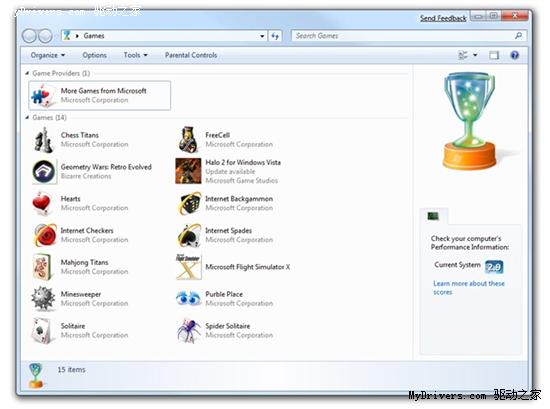 概述:在Windows Vista中微软推出了游戏管理器(Games Explorer),你可以利用它发布和管理游戏,包括内置的Windows游戏和PC游戏,比如纸牌、国际象棋和Windows Live游戏等。在Windows 7中,游戏管理器中新增了很多功能,这些功能不仅能帮助普通玩家管理Windows 7中的内置游戏,而且对那些PC游戏玩家来说也会很有帮助。