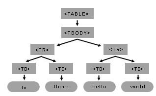 你可以只用一些DOM方法来创建这个表格和它内部的子元素。请在脑海中时刻保留你想要创建的数据结构的树之模型,这样有利于更简便的写出必须的代码。在图1的TABLE树中,TABLE有一个子元素TBODY。TBODY有两个子元素。每一个TR又含有两个子元素(TD)。最后,每一个TD有一个子元素--文本节点。