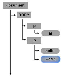 在测试了这个例子之后,我们注意到,hello和world单词被组合在了一个:helloworld。事实上,当你看到HTML页面时,hello和world两个文字节点看起来更像是一个节点。但是请记住它们在文档模型中的形式--是两个节点。第二个节点是一个TEXT_NODE类型的新节点,也是第二个P标签的第二个子元素。下面的图标将在文档树种展示最近创建的文本节点对象。