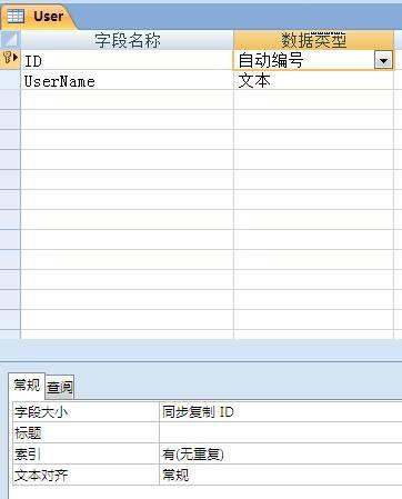 首先建立一个数据库,这里使用的Accesee 2000-2003数据库,命名为Database.mdb,在其中建立User表: