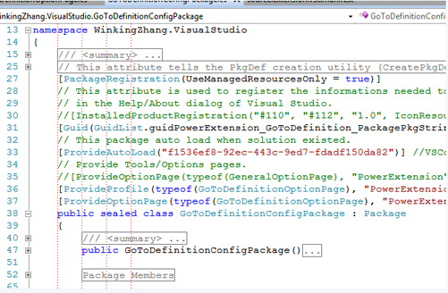 首先创建一个Package工程,找到里面的XX_Package.cs,要提供自定义配置到IDE,需要在这里通过ProviderProfile和ProviderOptionPage告诉Package两个重要信息:此Package有配置信息(Profiler)以及对应该配置信息的界面,这里我从我的GotoDef extension工程里截了一张图: