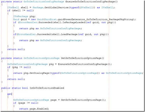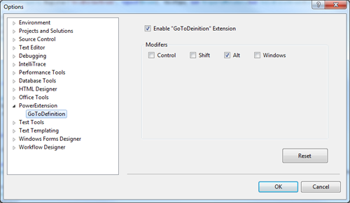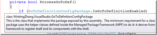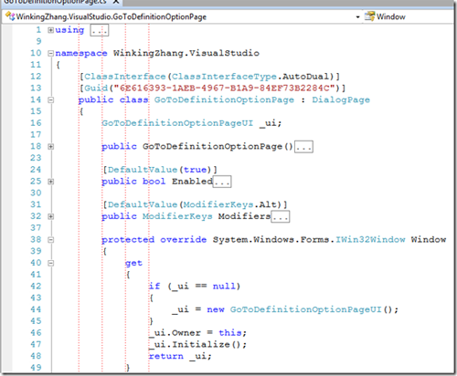 另一个ProvideOptionPage来指定配置信息对象和界面,它是从DialogPage派生,需要注意的是需要为它提供Guid和ClassInterface类型;默认情况下,显示该配置对象使用PropertyGrid,当然,可以通过override Window属性来自定义自己的UI,比如GoToDef中的配置UI,如下图: