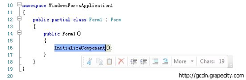 1、当在代码编辑器中选择一段文字,并将鼠标移到文字区域时,QuickToolbar会以半透明的方式"浮"文字的旁边。