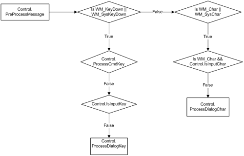 对于WM_KeyDown消息,其预处理Control类上有三个时机:ProcessCmdKey,IsInputKey以及ProcessDialogKey;对于WM_KeyChar消息,其预处理有两个时机:IsInputChar和ProcessDialogChar。