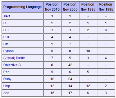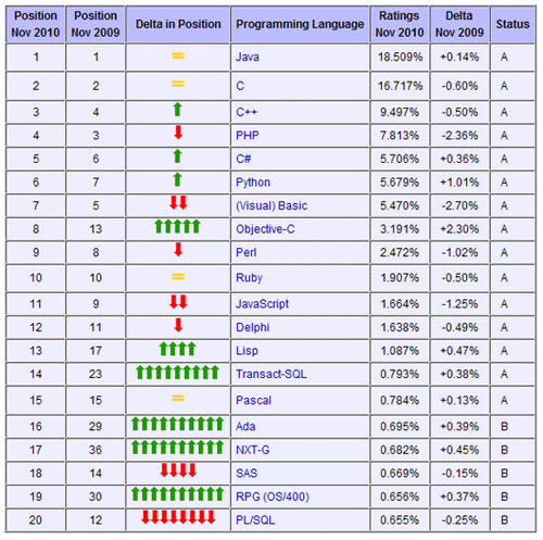 概述:TIOBE编程语言排行榜的11月榜单近日发布。从榜单上可以看出,在过去很长一段时间内都呈现持续增长趋势的Objective-C从上个月开始所占份额第一次有所下降,11月份相比10月又下降了0.5%。这是不是说明iPhone热潮已经开始消退了呢?乐高的Mindstorms编程语言NXT-G首次跻身跃入排行榜的前20名,是11月排行榜一个亮点。同时Google的Go语言突然跌出前20名,Visual Basic由曾经的排行榜之首到本月的跌至低谷,颓废明显,也是11月排行榜值得关注的地方。