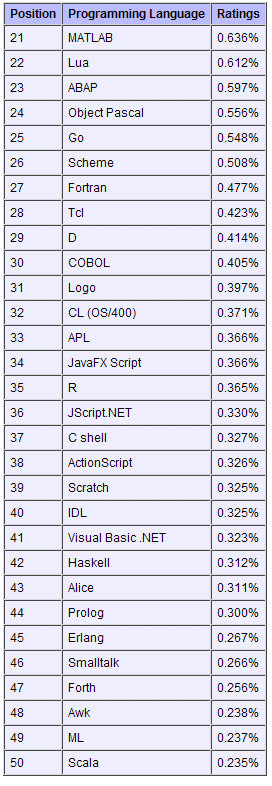 这个榜单本身采集的是英文世界的数据,虽然在反映趋势上有较高的参考意义,但与中国的实际情况不完全符合,此外,这张采样本身也有相当大的局限性。《程序员》2010年8月刊的圆桌讨论“什么是最美丽的编程语言”中,许多专家也谈到了这一点。