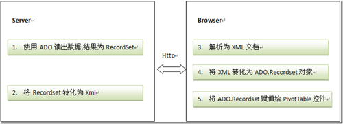对于后两种数据源,我没有试过,就不说了。下面只以关系数据库为例。由于我是在IE中使用PivotTable控件的,所以只能使用离线数据。基本的思路是