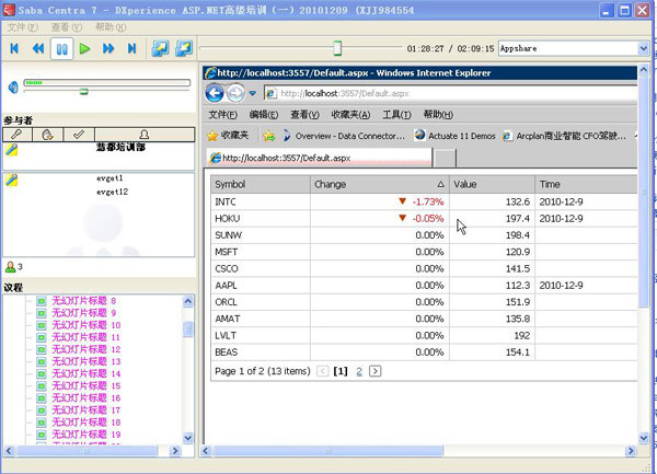 2010年11月9日上午10时,为期两天的DXperience ASP.NET高级培训正式开始了,慧都高级培训师根据北京康桥佳合友人们的培训需求,对DXperience ASP.NET套包中的各个子控件进行了详细介绍,包括每个产品的功能特征、具体实现效果和方法以及在行业中的应用案例等,并且结合具体的项目,组织客户进行了实战演练。