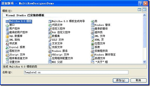 然后打开"项目" 菜单,选择"添加新项",并在对话框中选择"MultiRow 6.0 模板"就可以直接添加一个空白的模板,选择"MultiRow 6.0 模板生成向导"则会启动模版生成向导。