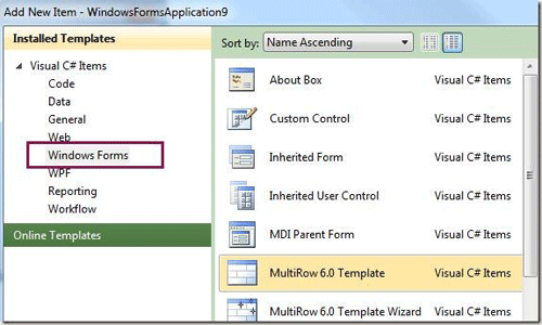 如果你用的是Visual Studio 2008 或者Visual Studio 2010,也许这个对话框中有太多的项而不太容易找到MultiRow的模板,那么你可以在左边选择Windows Forms的子项,这样找起来就容易多了: