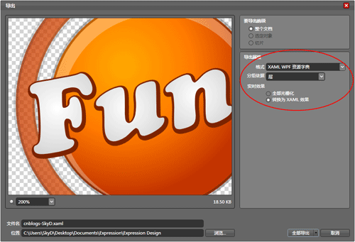 接下来点击菜单“文件 > 导出...”,将格式设为“XAML WPF 资源字典”,分组依据设为“层”,实时效果设为“转换为XAML效果”(貌似无用的设置)。然后按“浏览...”按钮选择输出路径,然后按“全部导出”按钮完成导出。