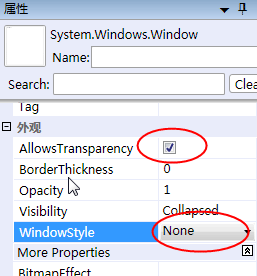 然后打开“Window1.xaml”文件的设计视图,点击窗体边缘以选中窗体,依照下图所示,在属性面板中更改AllowsTransparency及WindowStyle属性。