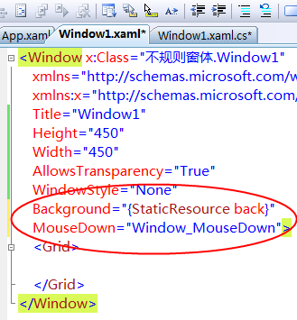 切换到XAML代码视图,依照下图所示,为 Window 元素添加Background和 MouseDown属性定义。