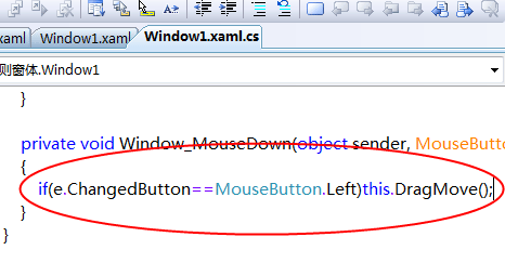 在上图的“Window_MouseDown”字符上单击右键,在弹出菜单中选择“定位到事件处理程序”,即会转到“Window1.xaml.cs”代码视图,依照下图输入代码。