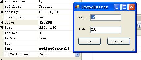 在这个对话框里,我们要把OK按钮的DialogResult属性设为OK(当点击OK按钮时,模态对话框关闭,并返回DialogResult.OK),将Cancel按钮的DialogResult属性设为Cancel(当点击OK按钮时,模态对话框关闭,并返回DialogResult.OK)。另外我们要对用户输入的值做验证,以保证Scope的min和max值都是Int32类型。下边是对话框的代码: