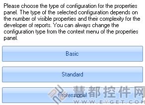 当你首次运行设计器时很难理解属性面板上中组件的所有属性。为了简化这一任务,我们在属性面板中增加了配置选项,目前有三种配置方式:基础,标准,专业。不同的配置,组件的可视化属性的数量会有所变化。在基础配置中,只有简单属性是可视化的。在标准配置中,除了最复杂的或者很少使用的属性外,其他属性都是可视化的。在专业配置中,所有属性皆为可视化。首次运行报表设计器时可选择配置方式,也可从属性面板中的上下文菜单选择配置方式。