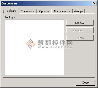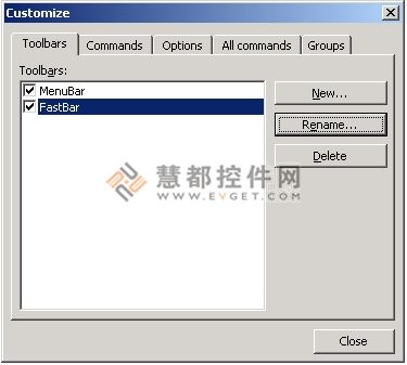 可以看到,设置窗口分成若干个Tab页面,来进行不同的设置。Toolbars页面的目的是设置不同的工具条。由于我们要建立菜单和快捷工具栏,所以点击“New”(如图),加入两个ToolBar,分别命名为MenuBar和FastBar。