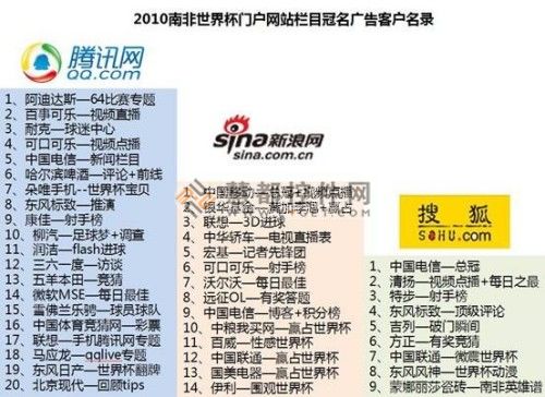 腾讯网官方宣称,为了争夺世界杯广告市场,腾讯网联手CNTV推出了独家视频直播,并搭建了独有的64场比赛专题,分别由国际品牌百事可乐和阿迪达斯冠名。而耐克和可口可乐则分别冠名了腾讯网球迷中心和视频点播栏目。此外,QQlive客户端世界杯专题、手机腾讯网世界杯专题都有冠名客户。