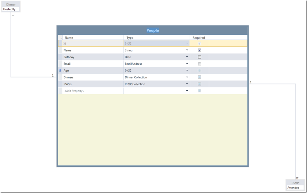一开始就然大家创建数据表(table),注意此数据表并非是真正的数据库中的表哦,可以说是一种抽象的数据表,或者是实体框架中的实体。我创建了一个名为的People的数据表: